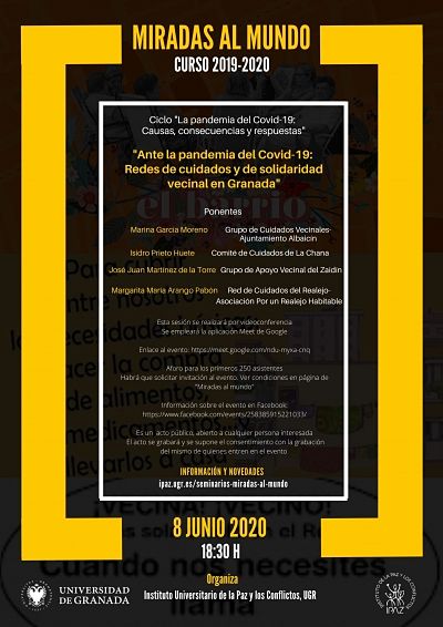En el marco de la iniciativa del Instituto de la Paz y los Conflictos de la UGR “Miradas al mundo” cuyo objetivo es el análisis, la reflexión y el debate sobre conflictos sociales relevantes, surge el ciclo de conferencias “La pandemia del COVID-19: Causas, consecuencias y respuestas” que pretende analizar la situación provocada por la pandemia desde diferentes puntos de vista.
